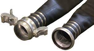 A quality rubber layflat discharge hose assembly, complete with male and female Bauer couplings with lever closure ring and Band-It preformed clamps, fitted